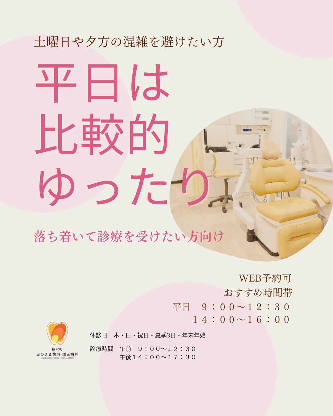 ご都合のよいお時間帯がございましたら、ぜひ平日もご検討ください。本年も、皆さまのお口の健康をサポートできるよう、
